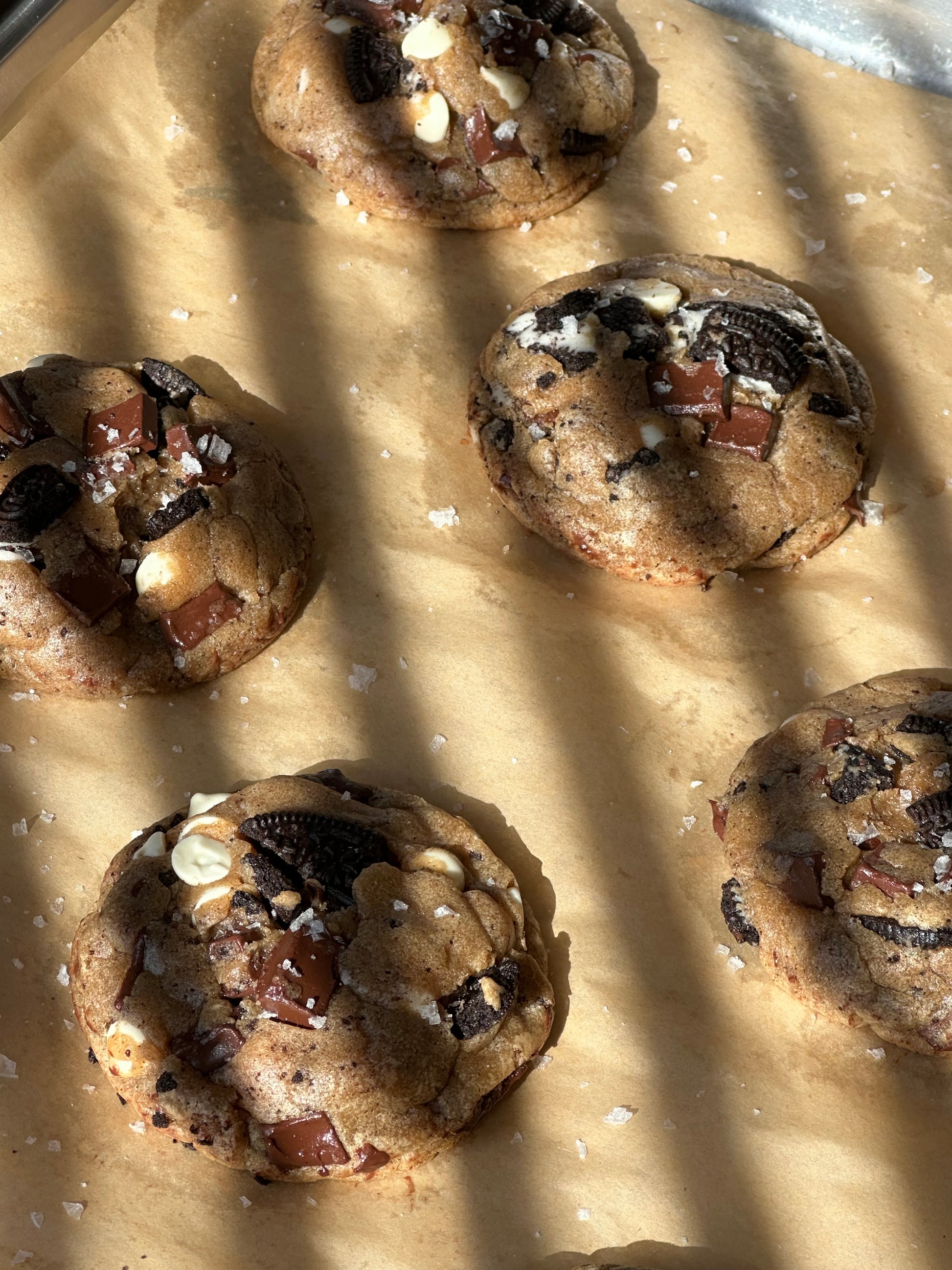 A cookies and cream dream from Payton at Baked by Brown Butter. Made with brown butter dough and packed with crushed Oreos, white chocolate chips, and dark chocolate chips for the perfect contrast. Every bite is rich, crunchy, creamy, and impossible to stop eating. Each order contains 4 cookies.